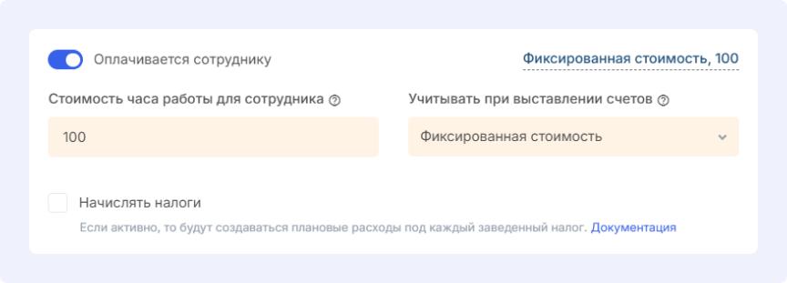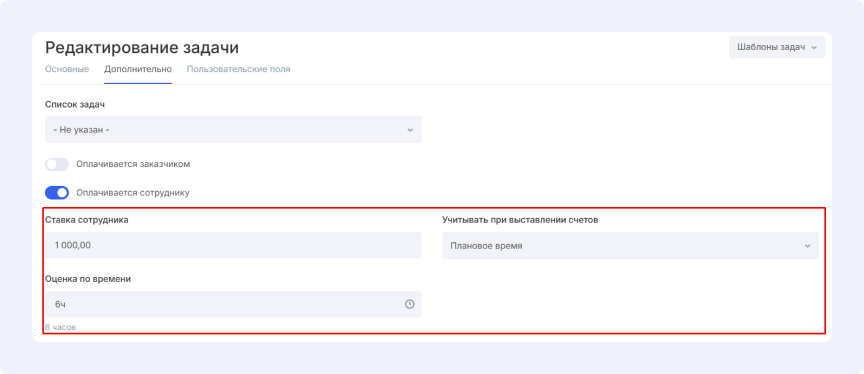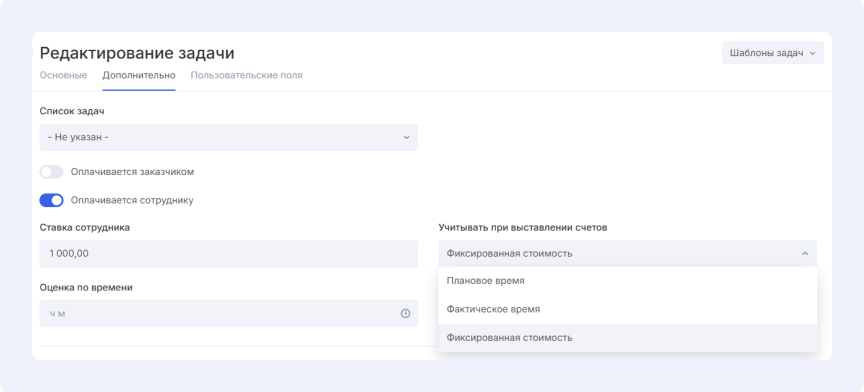 Для настройки просто укажите стоимость задачи при создании проекта. Система будет использовать эту сумму для расчета зарплаты независимо от фактически затраченного времени.