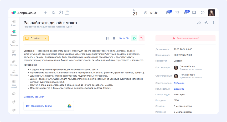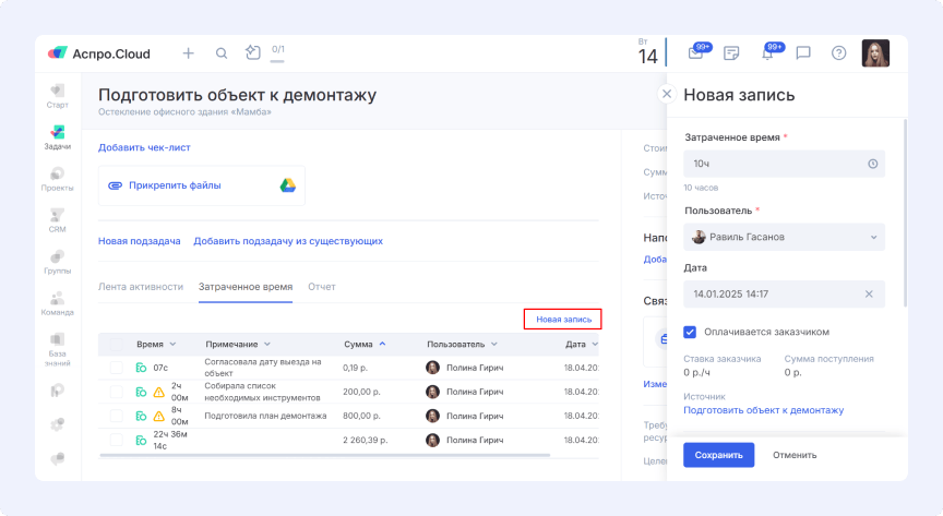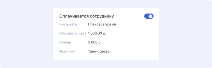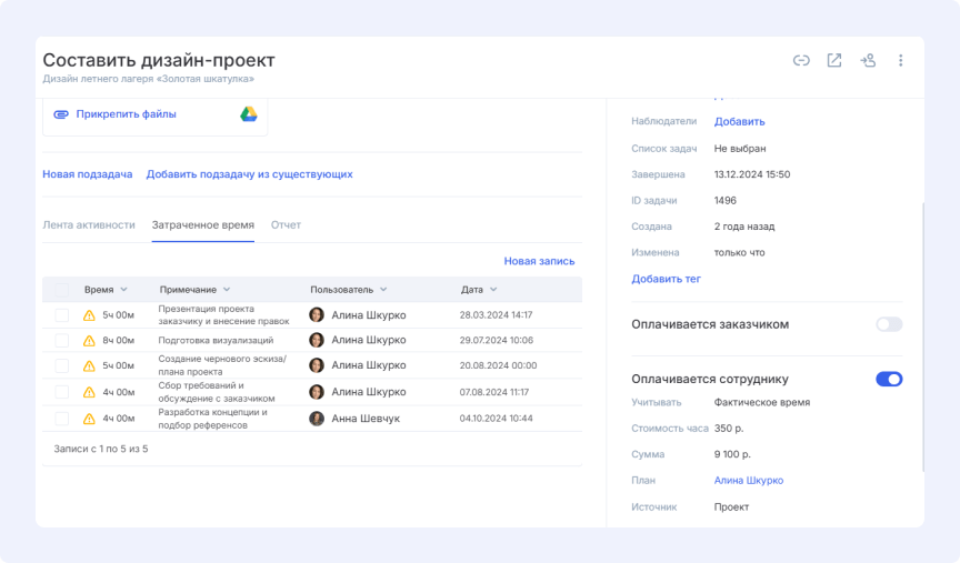Для настройки достаточно указать ставку каждого сотрудника при создании проекта и добавить планируемое время по задачам. Система автоматически рассчитает итоговую стоимость — например, за задачу длительностью 10 часов при ставке 500 рублей сотрудник получит 5000 рублей.