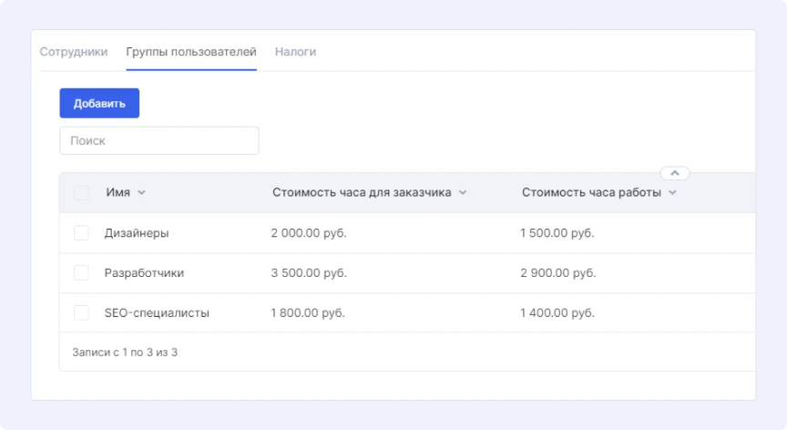 Ставки можно настраивать для отдельных сотрудников или целых отделов. У стажера, middle-специалиста и senior-разработчика будут разные часовые тарифы. При этом для нестандартных или особо сложных задач можно установить индивидуальную ставку, которая перекроет базовые настройки.
