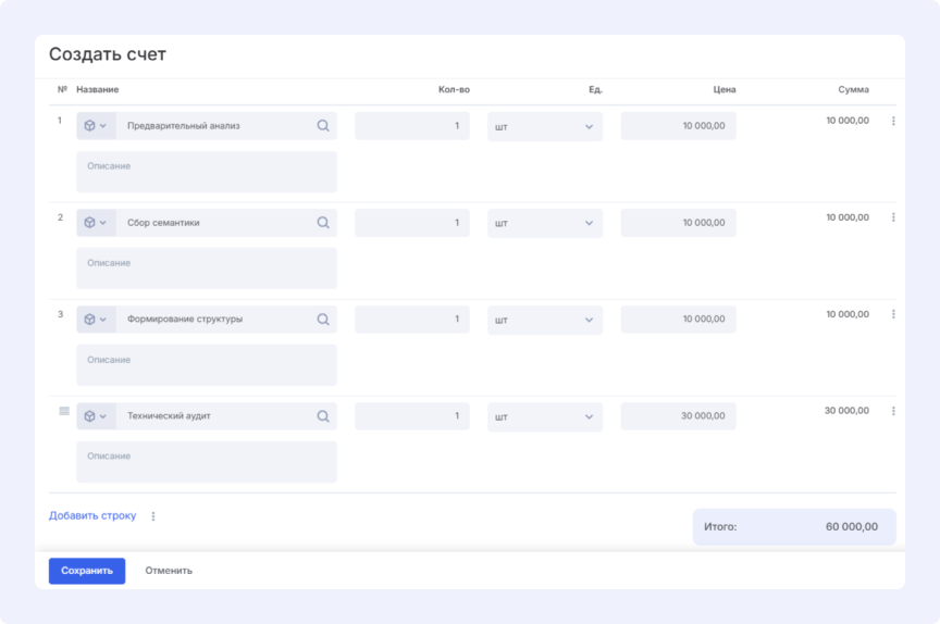 Алгоритм работы с предоплатными проектами состоит из трех шагов. Сначала выставляете счет клиенту прямо из карточки проекта. При формировании счета добавляете все планируемые задачи — можно выбрать из готового каталога услуг или создать новые позиции.