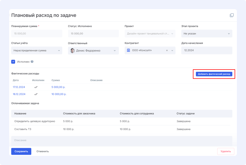 Плановые расходы на зарплату появляются автоматически: сразу при создании задач с фиксированной оплатой или плановым временем, либо после трекинга времени при оплате по факту. После выплаты зарплаты добавляете фактический расход, и система рассчитывает рентабельность проекта.