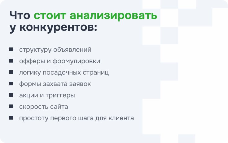 Это не означает, что нужно копировать чужую рекламу. Смысл в том, чтобы быстро понять, что в нише уже работает, где рынок перегрет, как все формулируют свои офферы и на чем можно выделиться без натужного креатива.