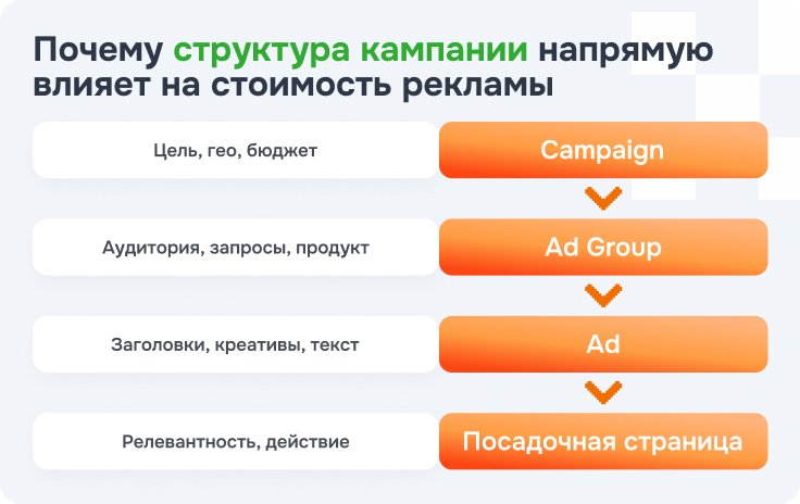 Одна из частых причин дорогого трафика – слабая структура кампании. Когда внутри одной кампании смешаны разные запросы, аудитории и продукты, реклама работает слишком широко. Алгоритм видит много разнородных сигналов, ключи конфликтуют между собой, объявления становятся менее точными, а аналитика – менее полезной. Поэтому структура нужна не для красоты, а для того, чтобы вы в любой момент понимали, что у вас работает, а что просто ест бюджет.