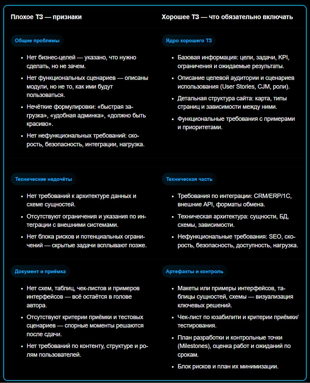 Хорошее ТЗ всегда включает прозрачный блок рисков, ограничений и технических зависимостей. Это то, что позволяет бизнесу видеть реальные границы проекта и принимать взвешенные решения.