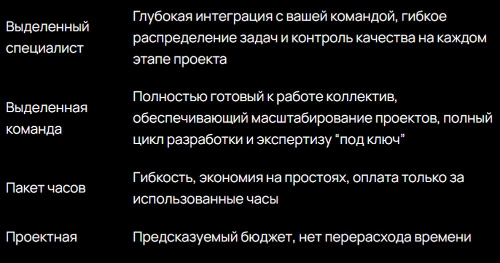 Полноценная команда: разработчики, тестировщики, PM. Идеально для крупных или долгосрочных проектов, где агентство хочет передать полный цикл разработки и поддержки.