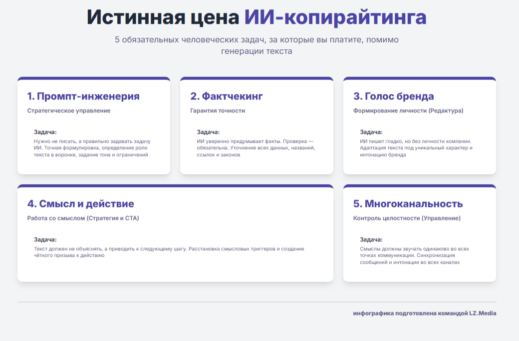 Фокус на «дешевых материалах» приводит к накоплению расходов: тексты набирают просмотры, но не работают на продукт, плохо передают ценность, снижают доверие и требуют переработки. Это главный экономический парадокс ИИ-эпохи: создание контента обходится дешевле, а вот доведение его «до ума» — гораздо дороже.