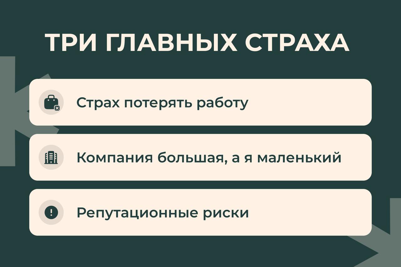 Сперва нужно понять корень проблемы. На моей практике сотрудники редко боятся реальности. Скорее они боятся собственных представлений о том, что может случиться. Например: «меня могут уволить», «мне испортят репутацию на рынке», «меня запомнят как неудобного сотрудника». Но теория почти никогда не происходит на практике — ведь довольно сложно представить, что нужно такого страшного сделать, чтобы сотрудника боялись нанимать, например, все EdTech-компании России. И тем не менее — три этих страха чаще всего не дают здраво оценить ситуацию,