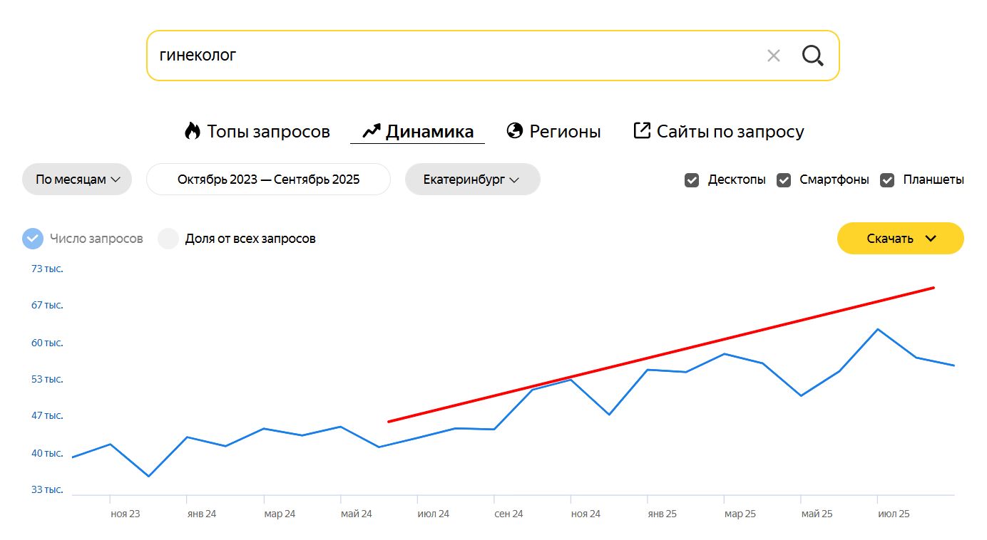 Введите в строку поиска нужные словосочетания, укажите регион и посмотрите на цифру — это и есть количество запросов в месяц от потенциальных пациентов.