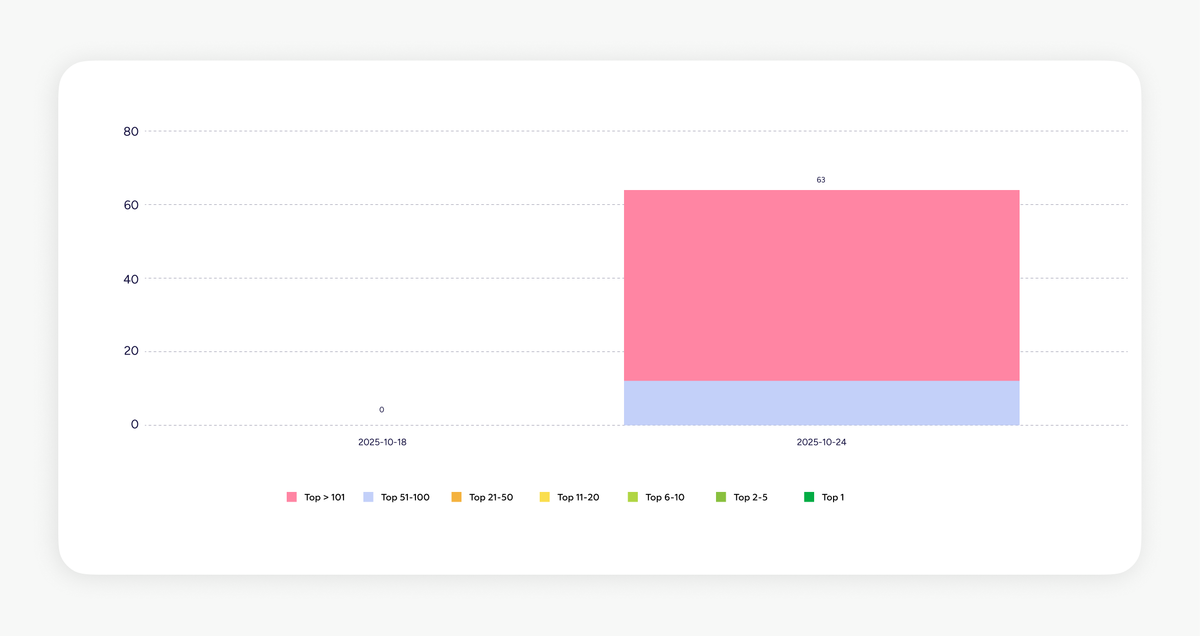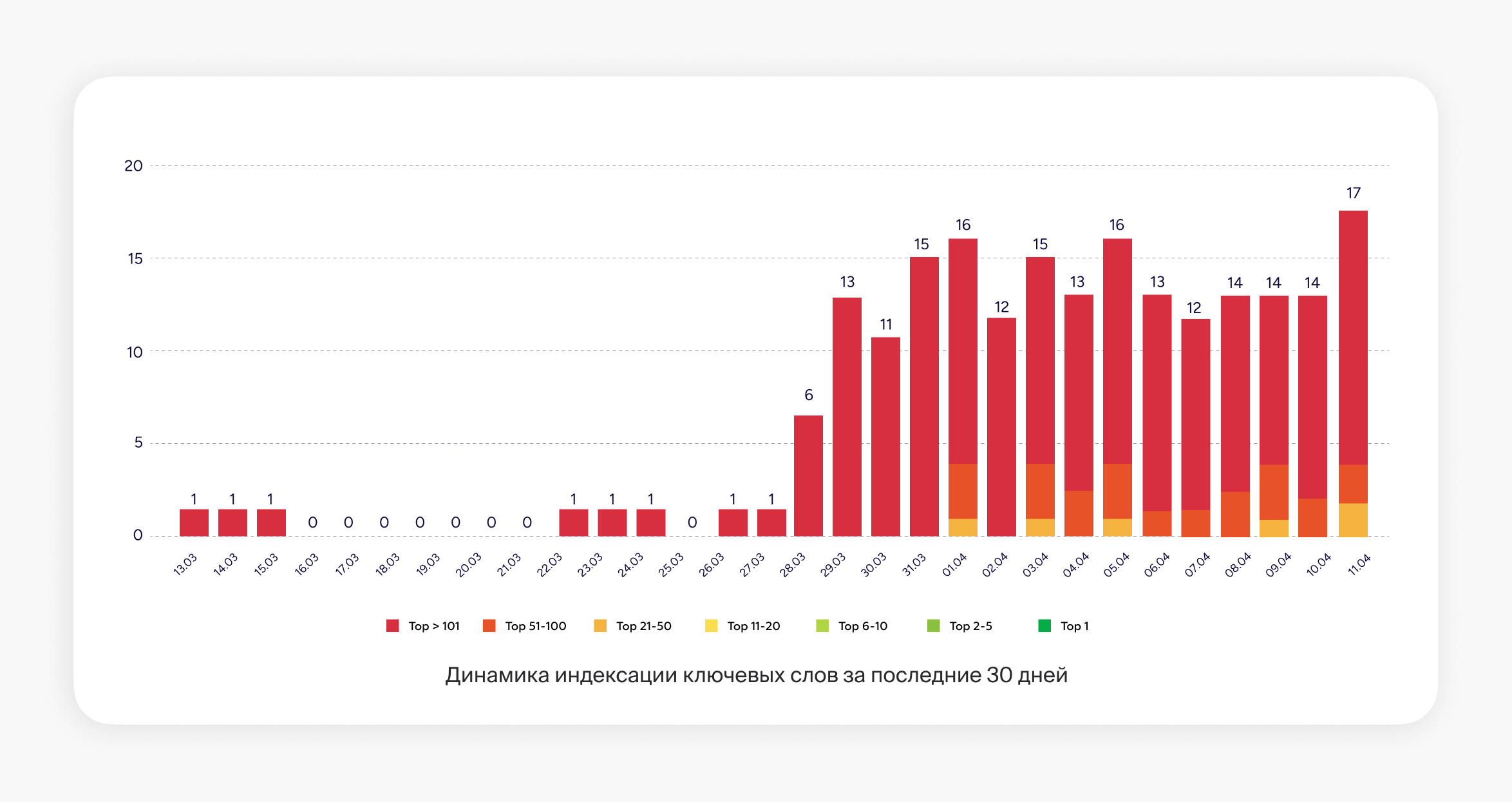 Стартовые позиции были невысокими — часть запросов находилась за пределами топ-100, часть в диапазоне топ-51–100. Однако само появление в выдаче уже создаёт основу для дальнейшего роста.