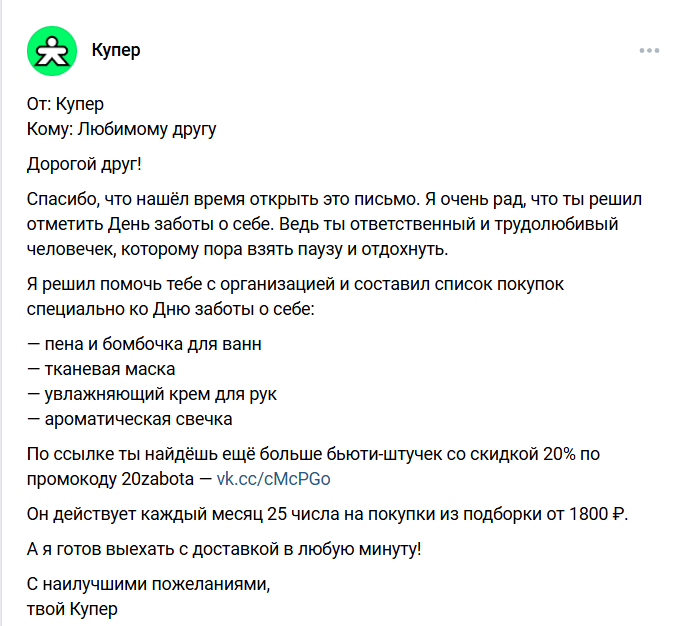 СберМаркет ака Купер Их соцсети — это не про покупки. Это про чувство, что ты часть большого, тёплого дома, где всё удобно, понятно и ты всегда на первом месте. Там не кричат «купи». Там рассказывают, как сэкономить, упростить жизнь и не тратить нервы. Да ещё и с лёгким юмором — без кринжа, но с заботой.