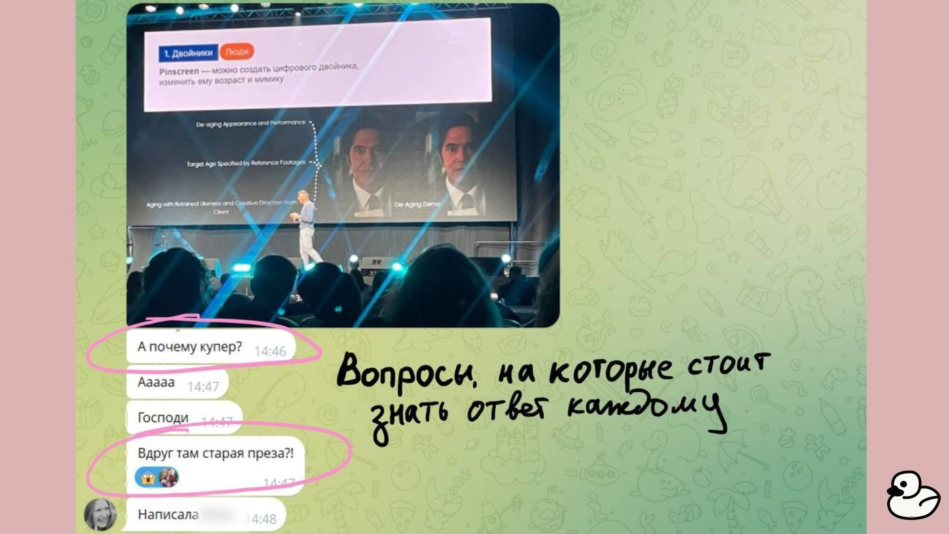 В общем, на пульте запустили не финальный док с презой, а черновой вариант — менеджер Ильи отправляла его заранее, чтобы орги в целом были в курсе, о чем он будет рассказывать.