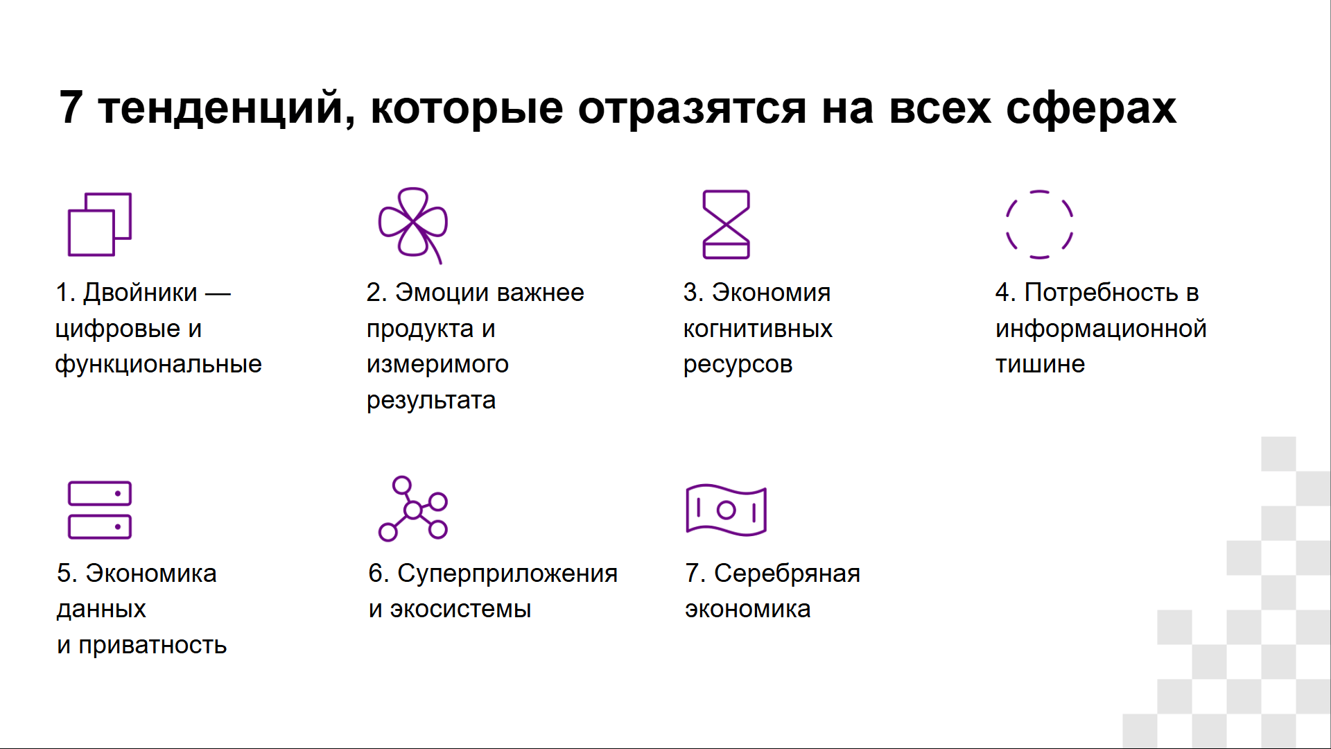 Например, суперприложения — отдельный вектор, и в то же время часть тезиса про экономию когнитивных ресурсов. И одновременно они противоречат тренду на тишину, когда ты такси не можешь себе быстро заказать, прорываясь через товары и доставки.