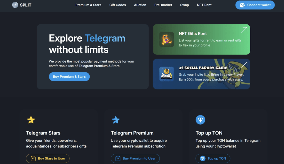 Split.tg — это не столько биржа, сколько многофункциональный сервис для работы с учетной записью Telegram, который, среди прочего, предлагает очень выгодное пополнение звезд Telegram. Часто курс звезды здесь один из самых низких на рынке. Сервис поддерживает множество способов оплаты, включая TON и банковские карты, что делает его идеальным выбором для тех, кто хочет просто и быстро пополнить баланс перед покупкой подарков в официальном магазине.