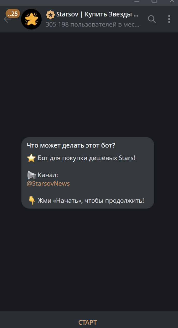 StarsovBot предлагает не только хорошие условия по курсу, но и систему бонусов для постоянных клиентов. Он также поддерживает покупку звезд Telegram за TON. Четкий интерфейс и оперативная поддержка делают работу с ним комфортной и безопасной.