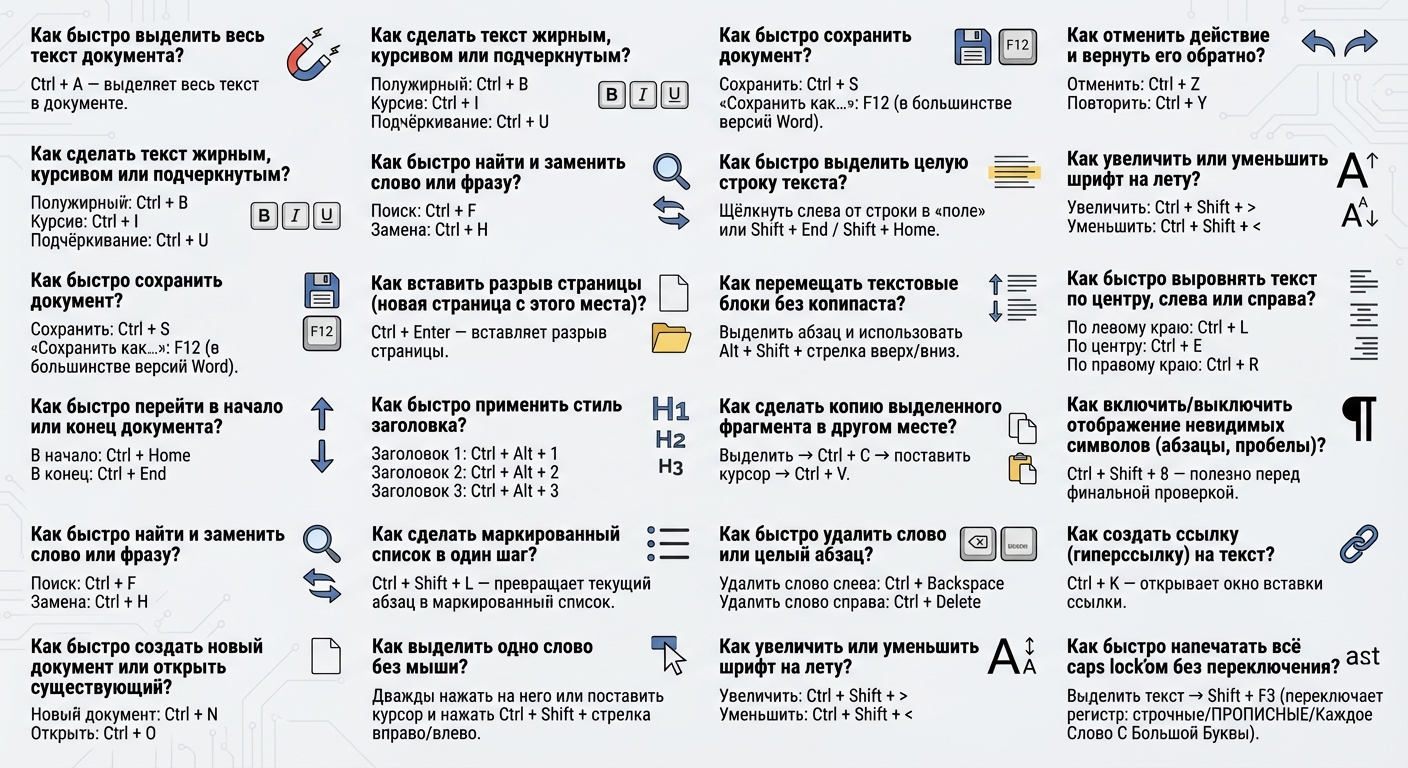 Когда вы редактируете документы в WORD, каждая лишняя мышиная «походка» по экрану съедает минуты. Горячие клавиши в Word помогают быстро выделять текст, форматировать заголовки, прыгать по документу и сохранять файл, не отрывая рук от клавиатуры. Ниже — компактная подборка ответов на самые частые вопросы: «а как это сделать быстрее?»