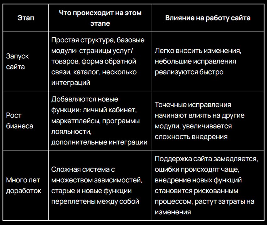 По мере развития бизнеса сайт усложняется. Новые функции зависят от старых, модули связаны между собой, а точечные исправления перестают работать эффективно.