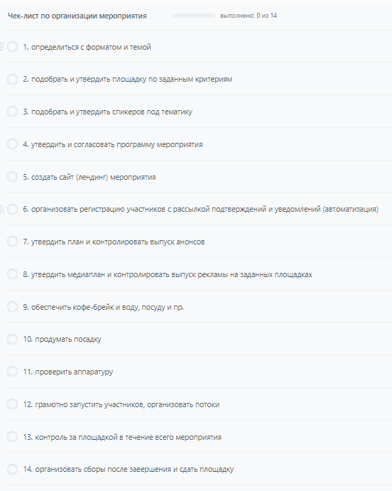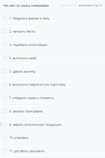 Чтобы во всем этом не запутаться, предлагаем использовать чек-листы, которые помогут структурировать, разбивая на части большую часть задач с распределением по времени и установкой дедлайнов: