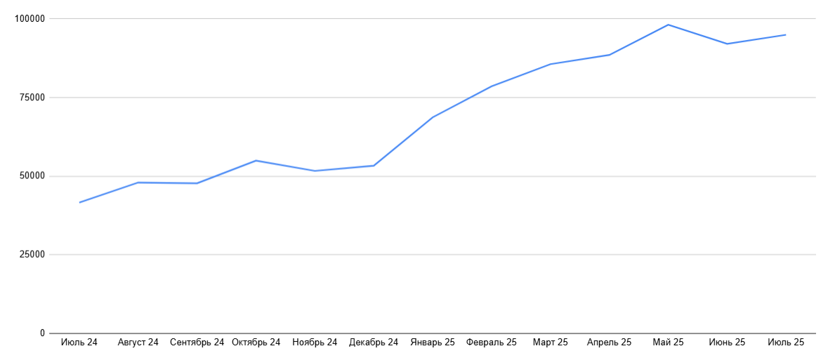 Клиент внес необходимые правки, и буквально сразу трафик сайта ракетой взлетел вверх. С апреля по июль 2025 трафик вырос примерно на 25 000 визитов в месяц, а год к году — в 2,28 раза.