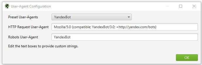 Затем мне пришла идея – сравнить в каком из user-agent в robots.txt сайта расположена закрывающая директива и какого user-agent эмулирует Frog. Оказалось, что в robots.txt, директива стоит только для user-agent yandex bot, а в Screaming Frog google bot. Чтобы проверить гипотезу, поменял google bot на yandex bot, запустил парсинг, но страницы остались.
