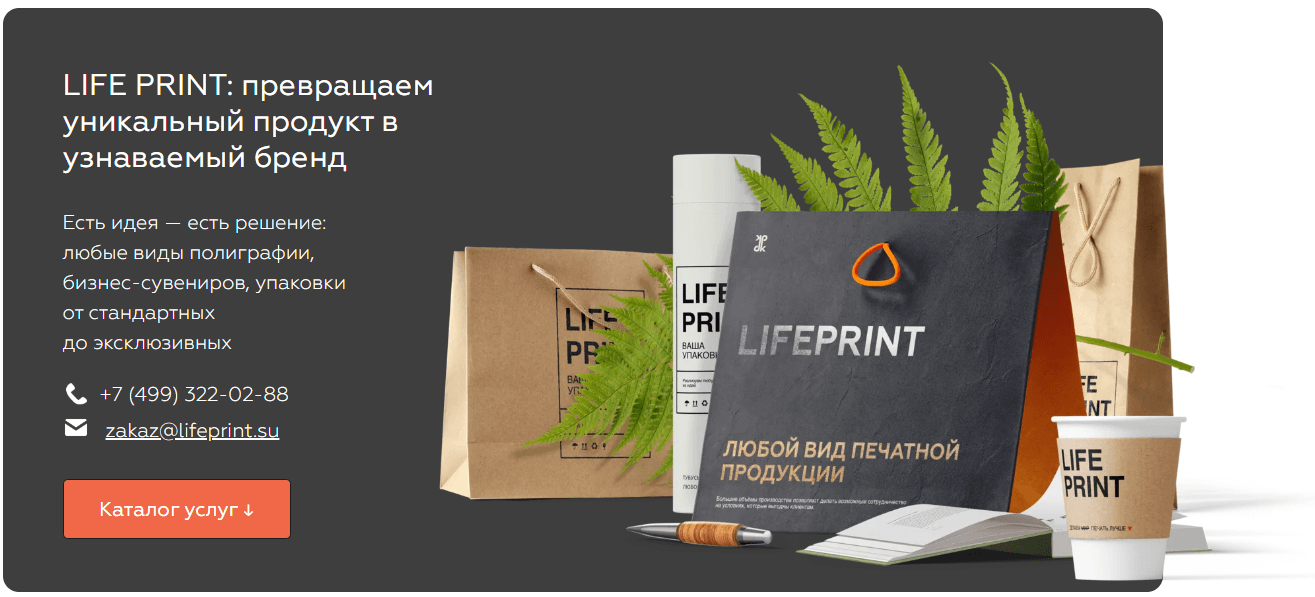 — Работайте с профессионалами. От нанесения логотипа заказчика на готовую продукцию до разработки эксклюзивных сувениров на заказ с брендированием на этапе производства — такой подход показывает глубокое понимание трендов отрасли, качественных и нестандартных решений в каждом ценовом сегменте. Мы в LIFE PRINT предлагаем как брендирование сувениров из нашего Каталога готовой продукции (более 20 тыс. уникальных позиций, доступных к оптовом заказу), так и производство уникальных сувениров на заказ — в России и за рубежом, причем можем взять на себя все этапы от предложения идей и разработки макетов до доставки готовой брендированной продукции прямо вам в офис.