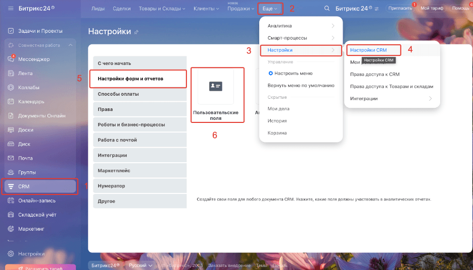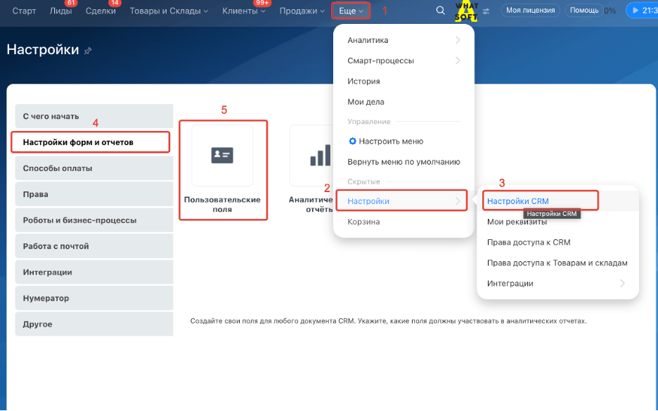 Для добавления пользовательского поля через настройки перейдите в CRM и выберите пункт «Настройки» (возможно, скрыт в пункте «Ещё»), далее – пункт «Настройки CRM». На открывшейся странице выберите пункт «Настройки форм и отчётов» и потом – «Пользовательские поля».