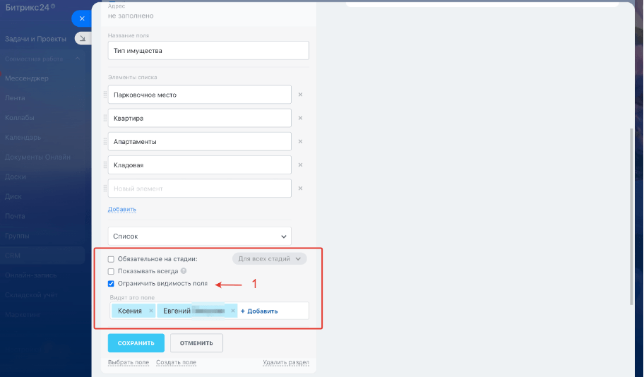 Для того чтобы настроить видимость поля, нажмите на значок шестерёнки рядом с полем. В выпадающем меню кликните по пункту «Настроить», после чего непосредственно под полем появится блок настройки видимости. Отметьте чекбокс «Ограничить видимость поля» и затем выберите пользователей или отделы, которым поле будет доступно.