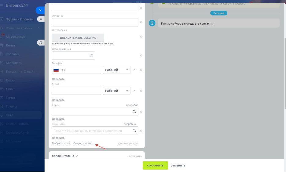 Создавать пользовательские поля можно либо через раздел «Настройки» в CRM, либо прямо в карточке элемента: контакта, сделки, задачи, счёта и т. д.