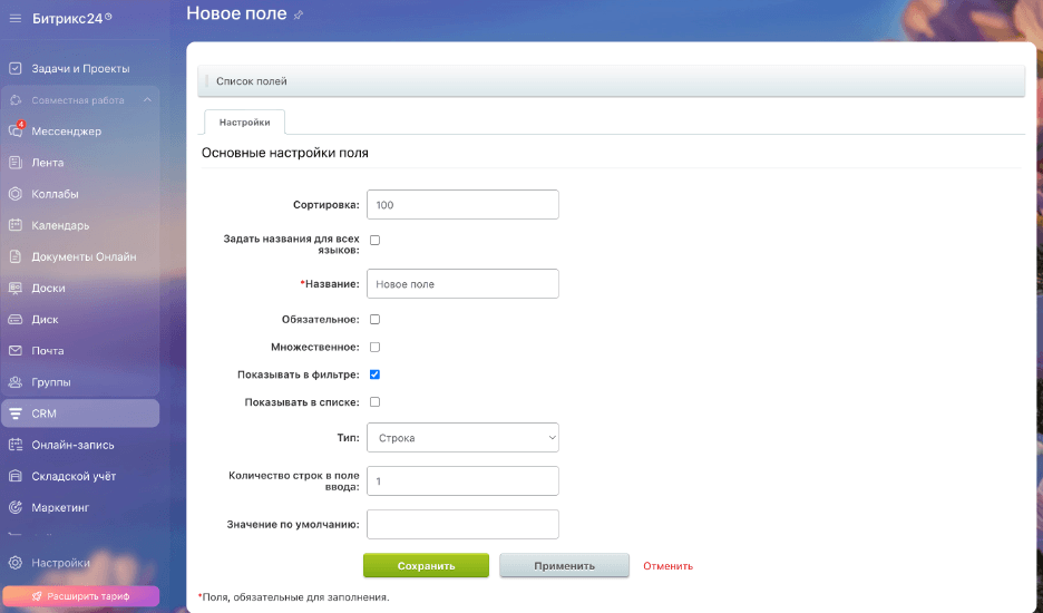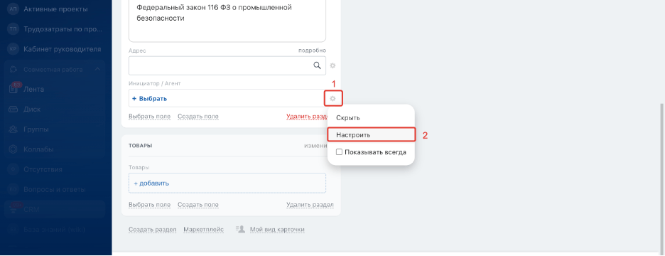 Второй способ редактирования настроек поля – это изменить параметры непосредственно в карточке CRM. Откройте любую карточку CRM, нажмите «Настройки» (шестерёнка) рядом с нужным полем и выберите пункт «Настроить». После внесения изменений нажмите кнопку «Сохранить».