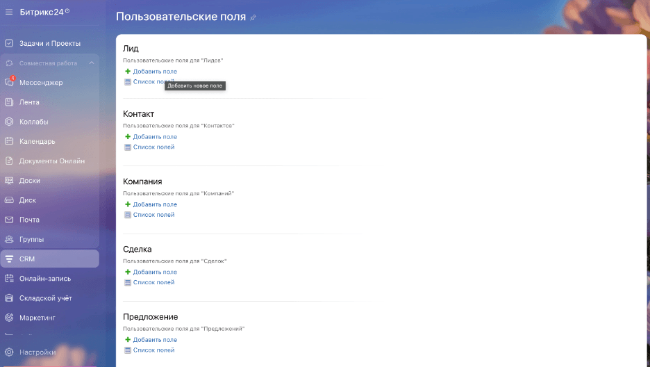 На открывшейся странице найдите сущность для добавления пользовательского поля и нажмите на ссылку «Добавить поле» под её заголовком.