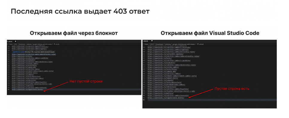 9. Последним действием, перед запуском скрипта, остается поместить в файл "urls.txt" страницы, которые вы хотите отправить на переиндексацию. Проверьте, чтобы в конце файла не было пустых строк, иначе скрипт не будет работать!