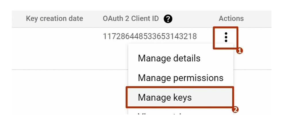 9. После попадания на новую страницу нажимаем на ︙в разделе "Actions" и выбираем "Manage keys".