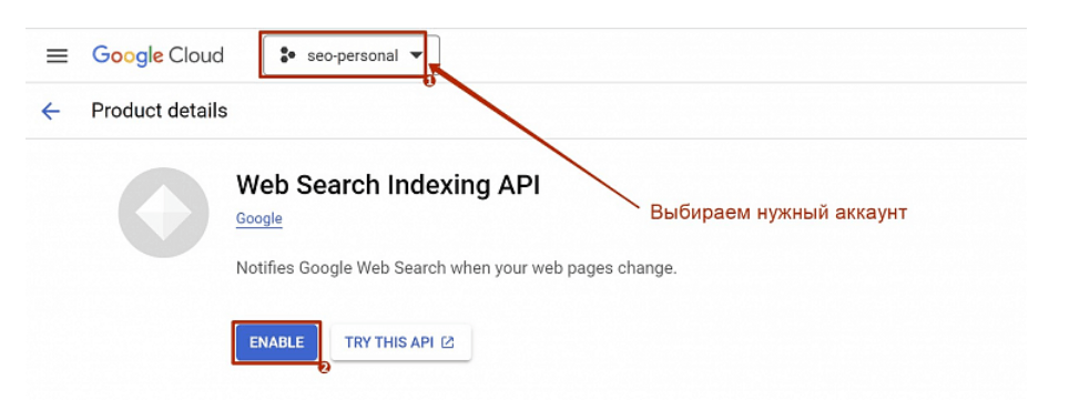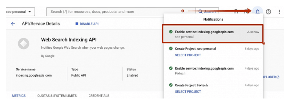 1. Для уведомления Google об изменении или создании новых страниц нужно включить Index API по ссылке.