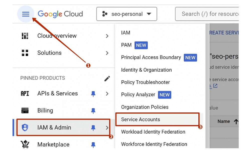 5. Далее нажимаем на бургер меню → переходим в раздел "IAM & Admin" → "Service Accounts".