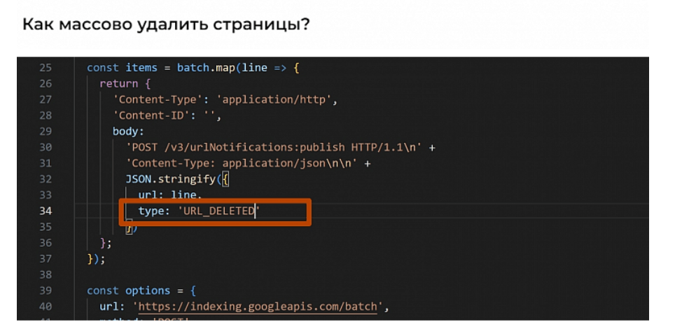 Если у вас уже всё настроено, то для массово удаления страниц откройте файл index.js и в строке 34 (смотрите внимательно, у вас может быть другая строка) замените URL_UPDATED на URL_DELETED. Само удаление страниц происходит также, как и отправка на переиндексацию.
