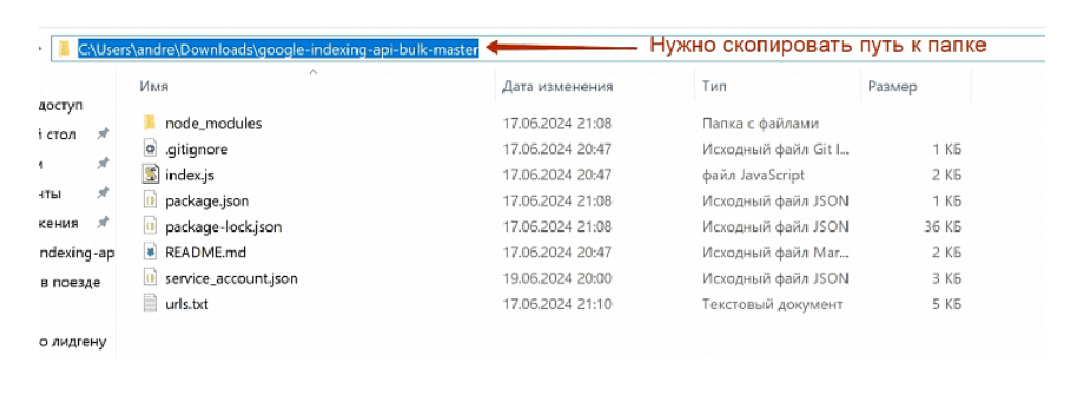 2. Откройте ранее скачанный JSON ключ и скопируйте все данные. После откройте ранее распакованную папку "google-indexing-api-bulk-master" → в ней откройте файл service_account.json → удалите все старые данные из этого файла → вставьте туда скопированные данные из JSON ключа.