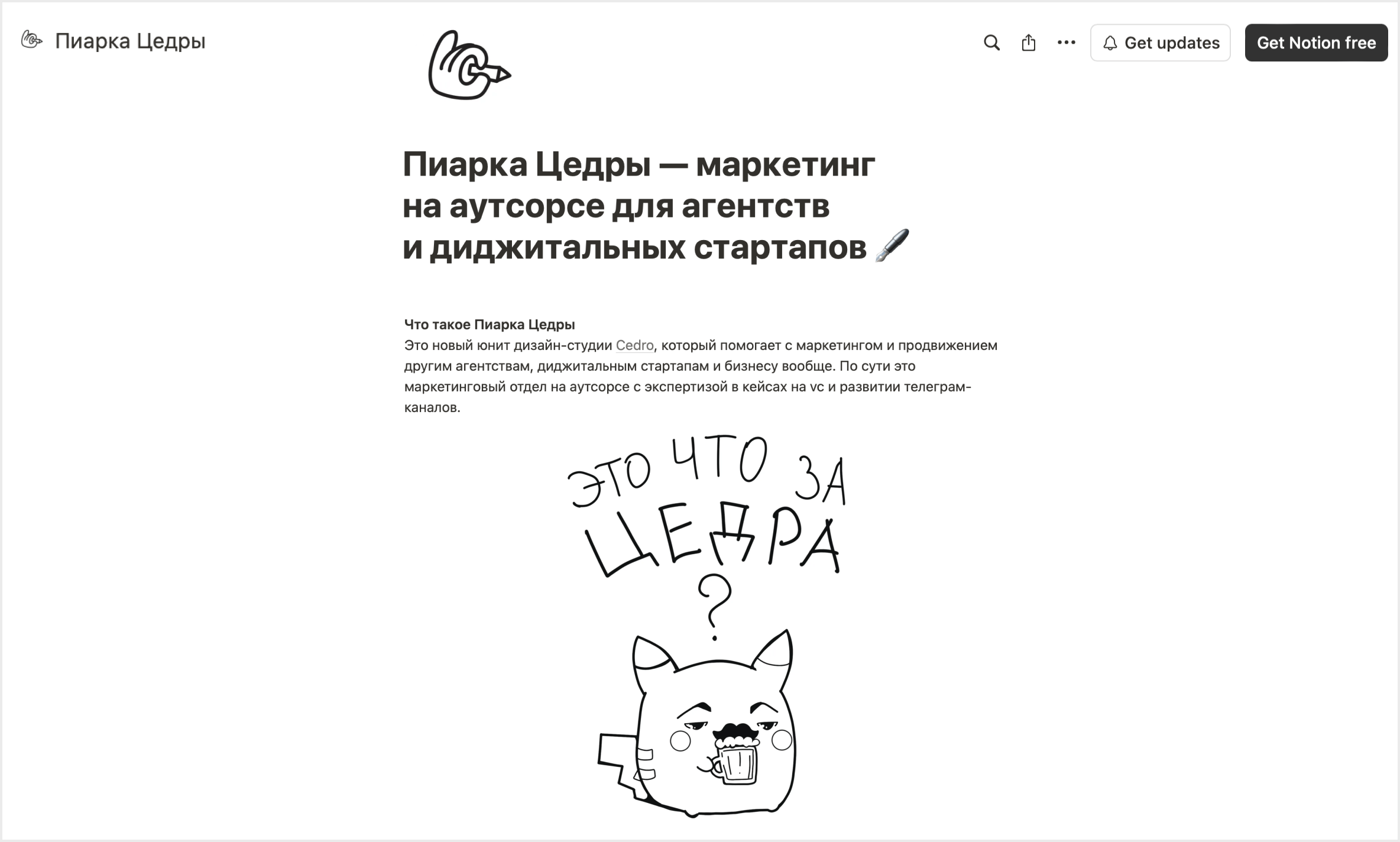 Вообще Пиарка — это агентство с узкой экспертизой: ещё четыре года назад ребята из Cedro начали вести канал про дизайн не как у всех и встряхнули рыночек своим маркетингом, а год назад решили помогать с этим другим дизайн-студиям. Теперь пишут кейсы, продвигают тг-каналы и генерят идеи для посевов и спецпроектов. Ещё ведут соцсети стартапам и корпам и даже на английском, но об этом у них можно спросить лично.