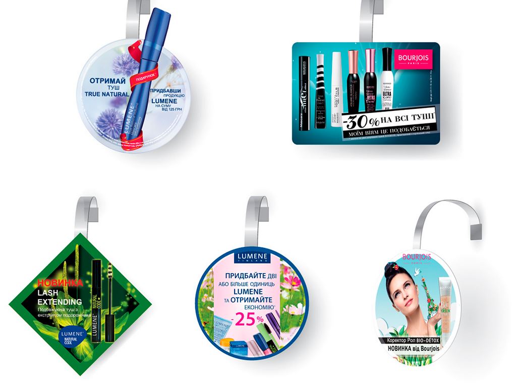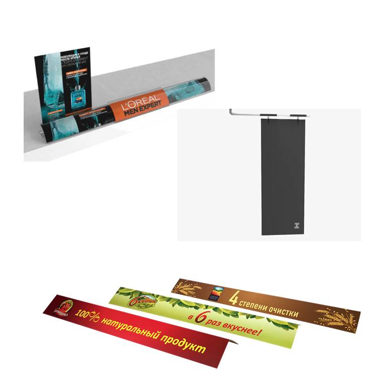 Шелфбаннеры (от англ. shelf – полка). Они выполняют роль разделителя секции с разными видами товаров на полке. Разместить их на полке нетрудно благодаря специальным креплениям. Это и элемент привлечения внимания, и дополнительный рекламный и брендовый носитель информации о продукте.