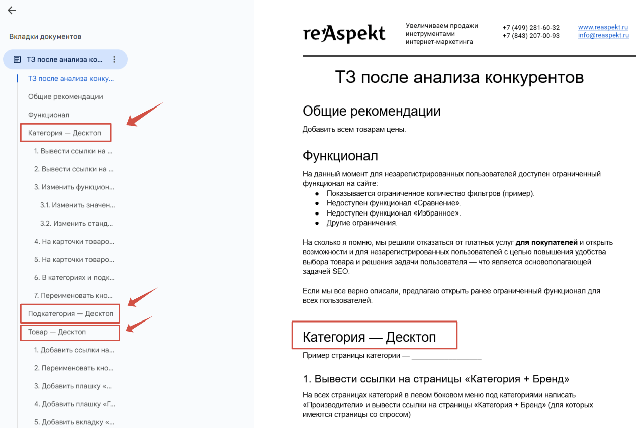 В Google документе создаем техническое задание по итогам анализа как в десктопной, так и в мобильной версии. Пункты прописываем структурировано с соблюдением последовательности элементов в сравнительном анализе в Google Sheets из шага №3.