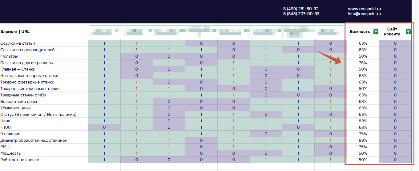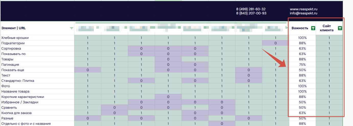 Колонка «Важность» отражает процентное значение. Это среднее значение по всем сайтам для конкретного элемента. Как правило, для последующей оценки мы берем во внимание те пункты, которые присутствуют более чем в 50% случаях у конкурентов включительно.