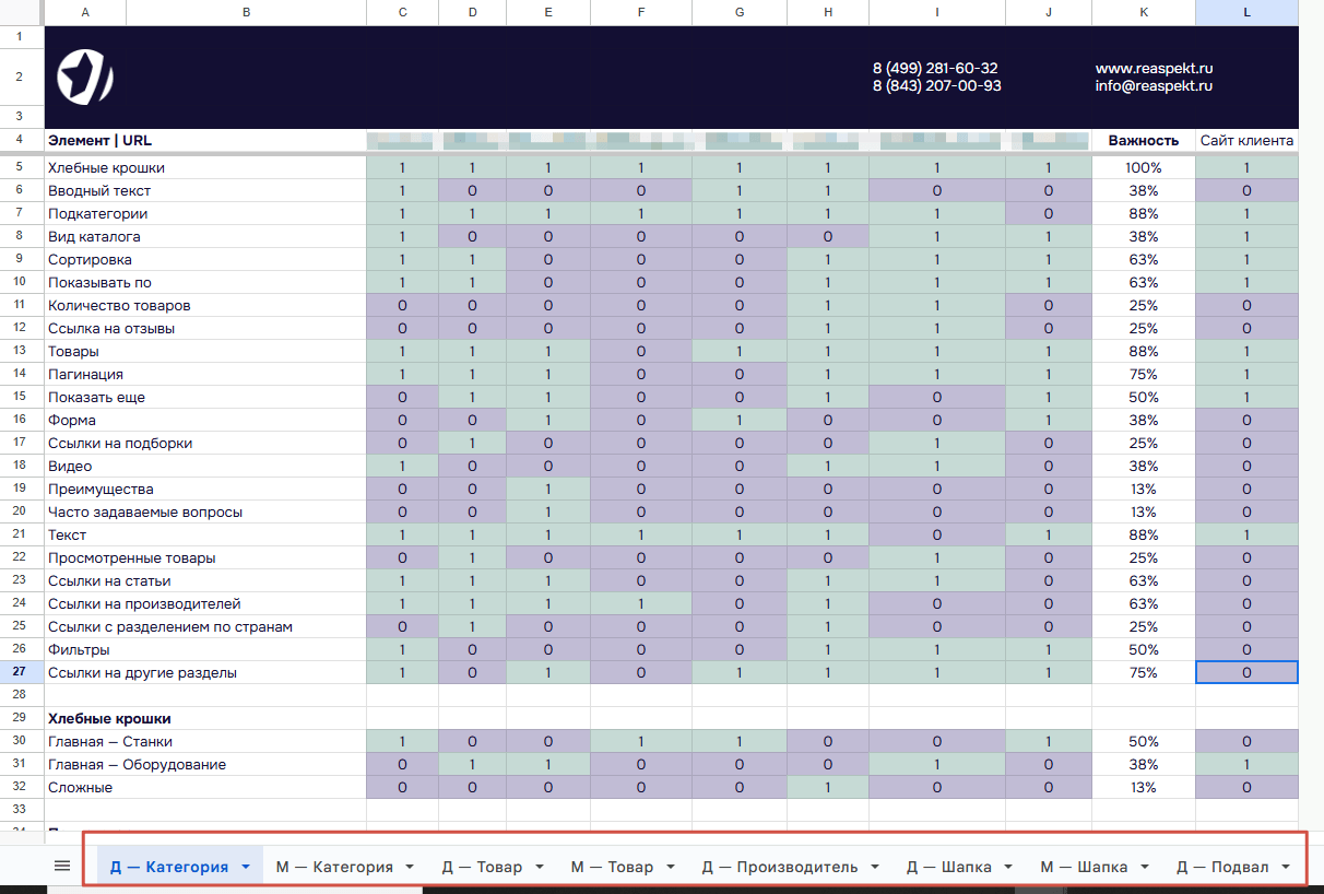 Просматриваем сайты конкурентов, оценивая все необходимые элементы, составляя список в первом столбце. Затем проверяем наличие элементов на прочих сайтах конкурентов и на сайте клиента. Элемент присутствует — ставим 1. Отсутствует — 0.