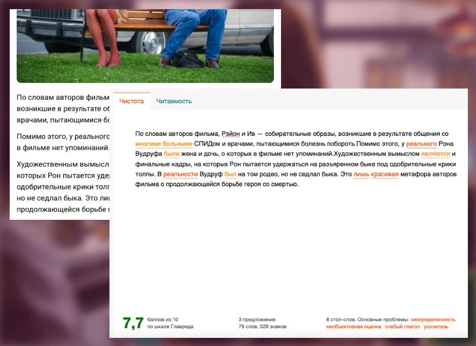 Суть. Копируем авторский текст в сервис Главред и смотрим на его оценку текста по инфостилю. Если не 10 из 10 – а так будет практически всегда – что ж, значит перед нами галимая вода!
