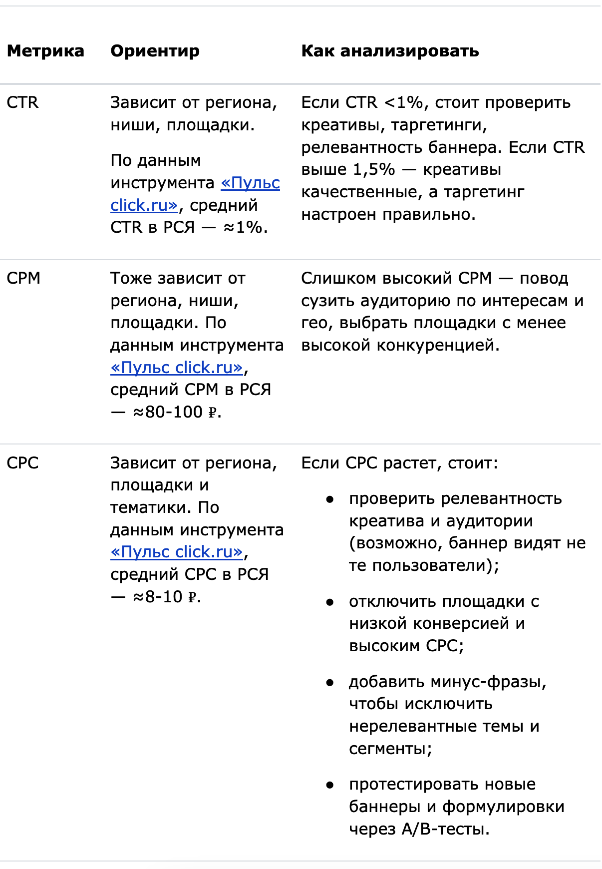 CTR — соотношение переходов к показам в процентах. Для медийных форматов высокий CTR не обязателен. Показатель лучше оценивать в динамике и в связке с конверсиями: рост CTR обычно говорит о качественном креативе, снижение — о необходимости его обновить.
