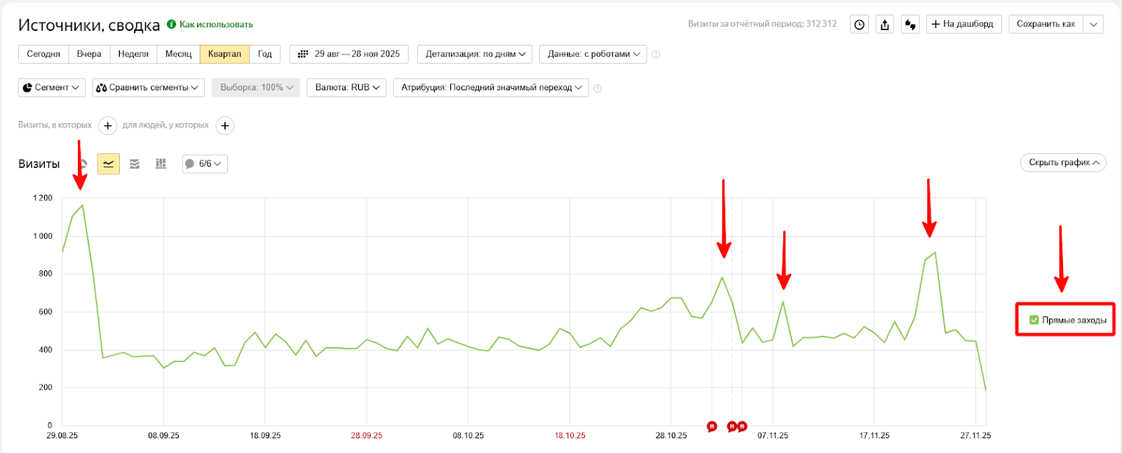 Девятый показатель надо анализировать в основном интерфейсе Метрики в отчете «Источники» → «Источники, сводка». Информацию по прямым переходам можно найти в пункте «Прямые заходы». Чтобы ознакомиться с трафиком по брендовым запросам, потребуется указать все варианты в блоке «Визиты, в которых» → «Поисковая фраза».