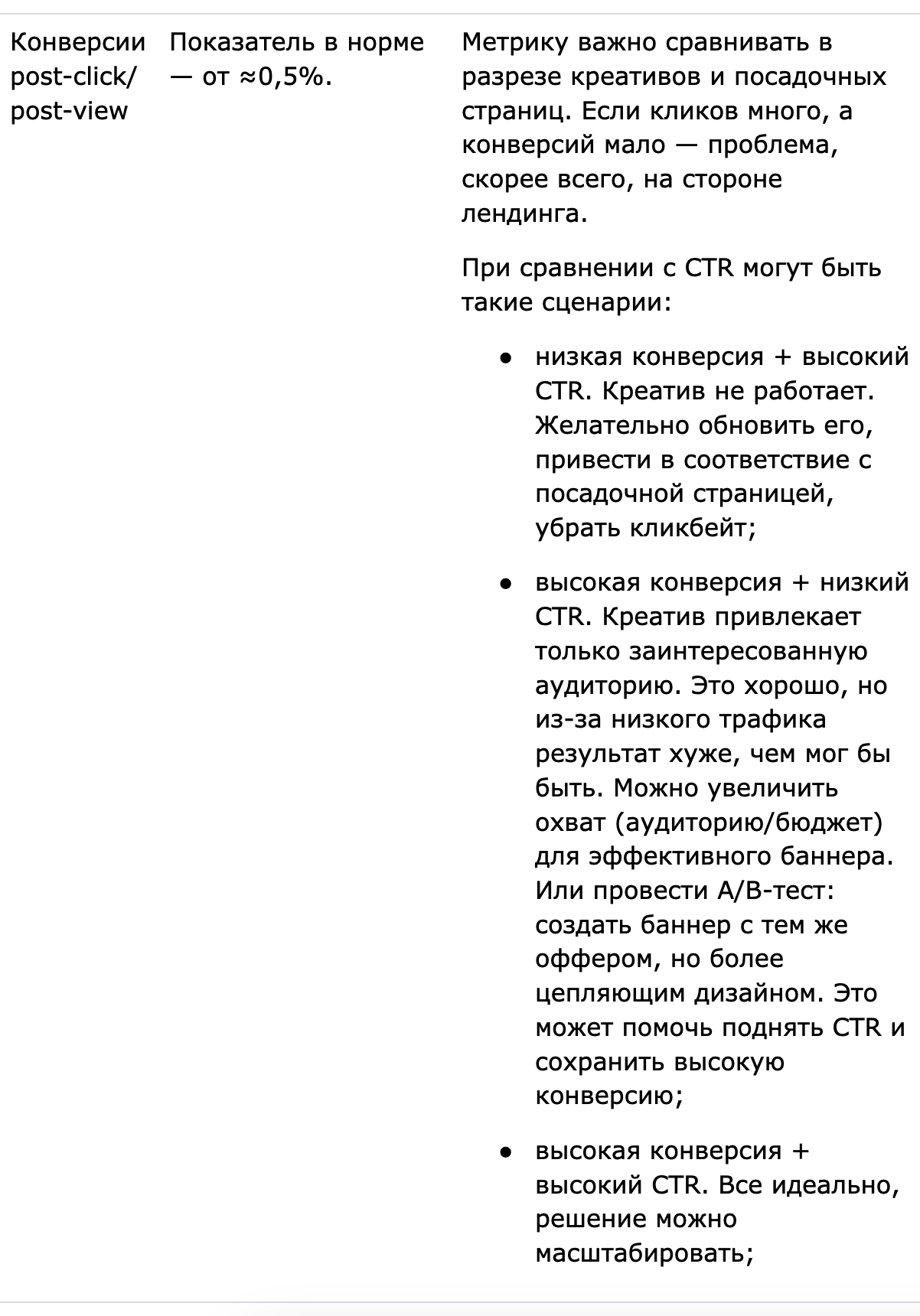 Post-click- и post-view-конверсии — общее число целевых действий (покупок, заявок, регистраций), совершенных после клика или просмотра рекламы. Данные стоит анализировать по площадкам, датам и креативам, чтобы выявлять устойчивые закономерности.