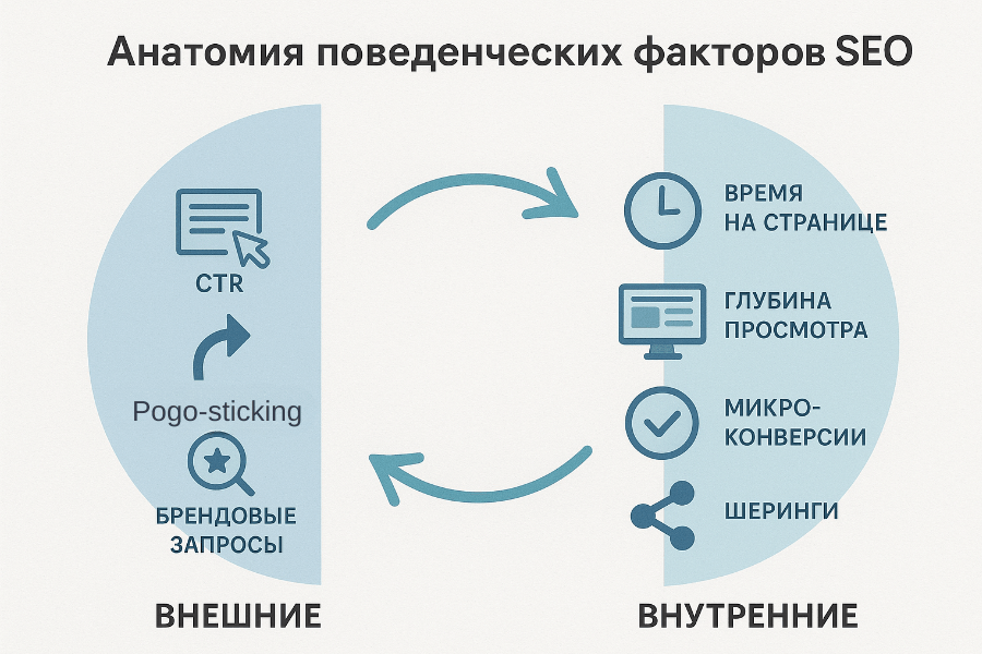 Поведенческие факторы делятся на внешние и внутренние. Первые показывают, как что происходит в выдаче, второй — что происходит уже после перехода, на сайте. Поисковые системы оценивают факторы в связке, потому что одно без другого не работает. Клик по сниппету запускает сеанс на сайте, качественное взаимодействие усиливает доверие, быстрый возврат назад в выдачу обнуляет эффект.