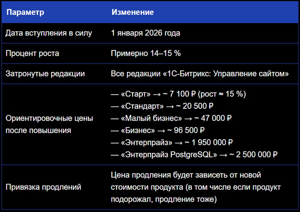 С 1 января 2026 года компания 1С-Битрикс впервые за три года планирует повысить цены на продукт «1С-Битрикс: Управление сайтом» на примерно 14-15 %.