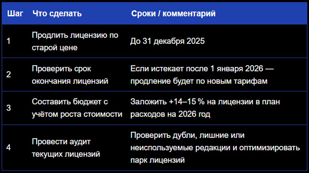 Проверьте сроки текущих лицензий. Если лицензия истекает в январе—феврале 2026 года или позже, продление будет осуществляться уже по новым тарифам, с учётом повышения цены.