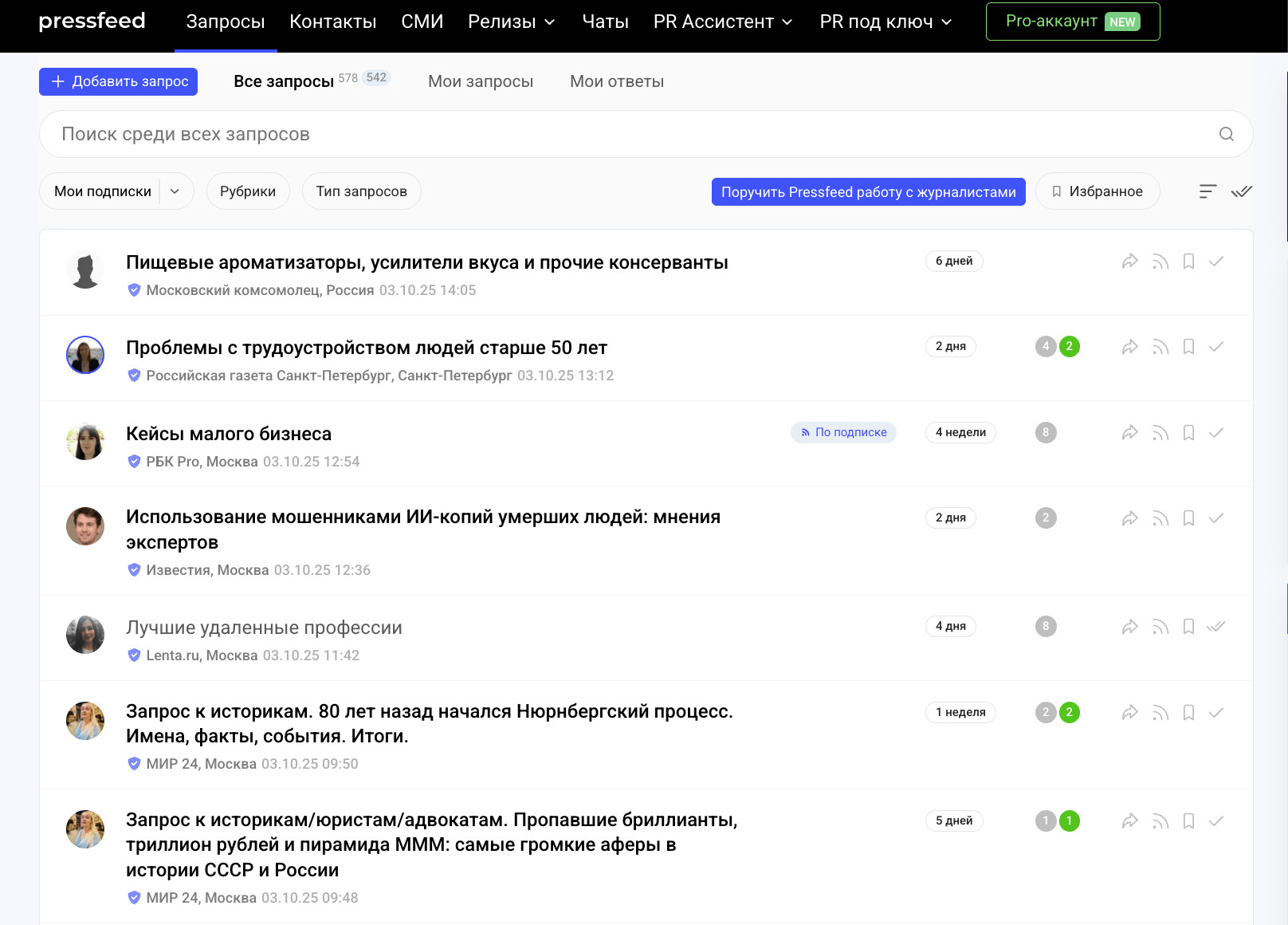 На Pressfeed журналисты из «Коммерсанта», «Известий», РБК, МИР24, Forbes и сотен других медиа публикуют вопросы по темам; эксперт или компания отправляет короткий по делу комментарий — и, если он подходит, попадает в материал бесплатно. Для бизнеса это простой способ получать упоминания в СМИ без больших бюджетов и агентств.