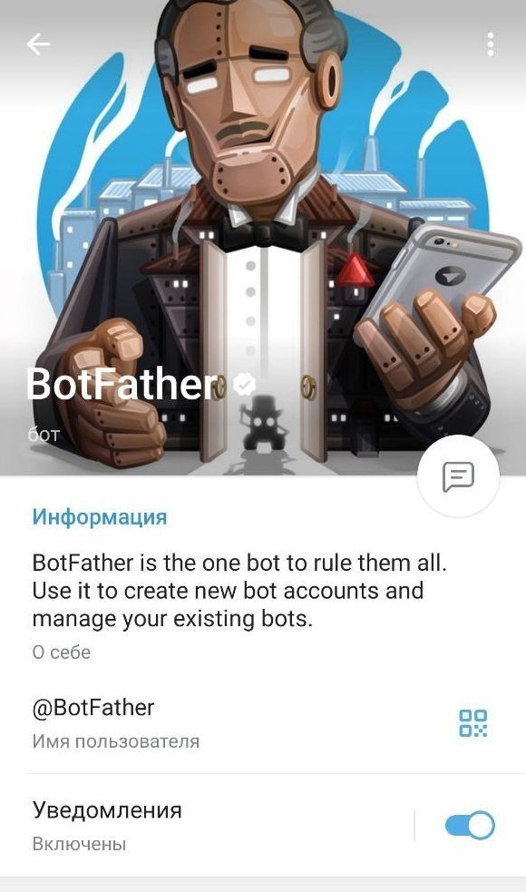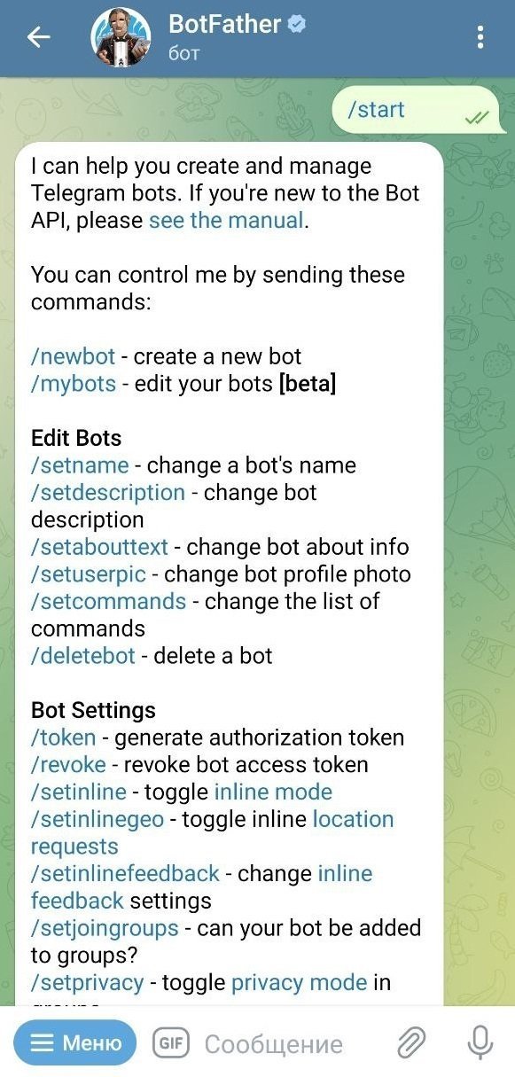 Сначала необходимо зарегистрировать аккаунт телеграм-бота. Для этого перейдите в официальный бот BotFather.