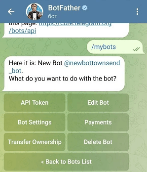 Для этого нужно снова зайти в BotFather и вбить команду /mybots. Выйдет список ботов, которые вы когда-либо создавали. Нажмите на кнопку с названием нужного бота. Вы увидите доступные вам команды: посмотреть токен, редактировать бот, поменять настройки, настроить приём платежей, передать права или удалить бот. Выберите нужный вам вариант.